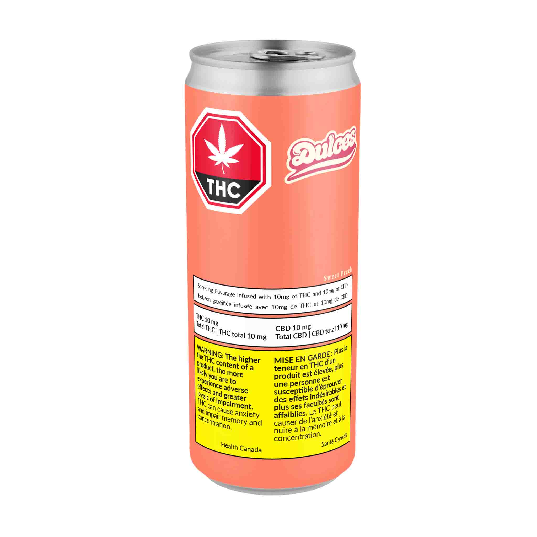 DULCES Sweet Peach is a nostalgic sweet candy soda that is bursting with a sweet and juicy peach flavour. Carbonated water, Sugar (sucrose, stevia), natural flavour, citric acid, cannabis emulsion (water, gum acacia, modified coconut oil (medium chain triglycerides), citric acid, vitamin E, potassium sorbate, sodium benzoate, quillaia extract), monk fruit juice concentrate, paprika concentrate (for colour), sodium benzoate, potassium sorbate. **Important Winter Shipping Advisory** Due to sub-freezing temperatures during transit, canned beverages may occasionally arrive with slightly swollen cans. This is a completely normal and harmless occurrence caused by the liquid inside temporarily freezing and expanding — it does not affect the safety, quality, or taste of the product once thawed. **If your cans arrive frozen or swollen:** Simply allow them to thaw completely at room temperature before opening and enjoying. The cans will return to their normal shape, and your beverages will be perfectly fine to drink. **Order Limit:** Each order can include a maximum of 24 canned beverages. To order more than 24, please place multiple orders. We appreciate your understanding during these colder months — thank you for choosing us! ❄️Additional Information