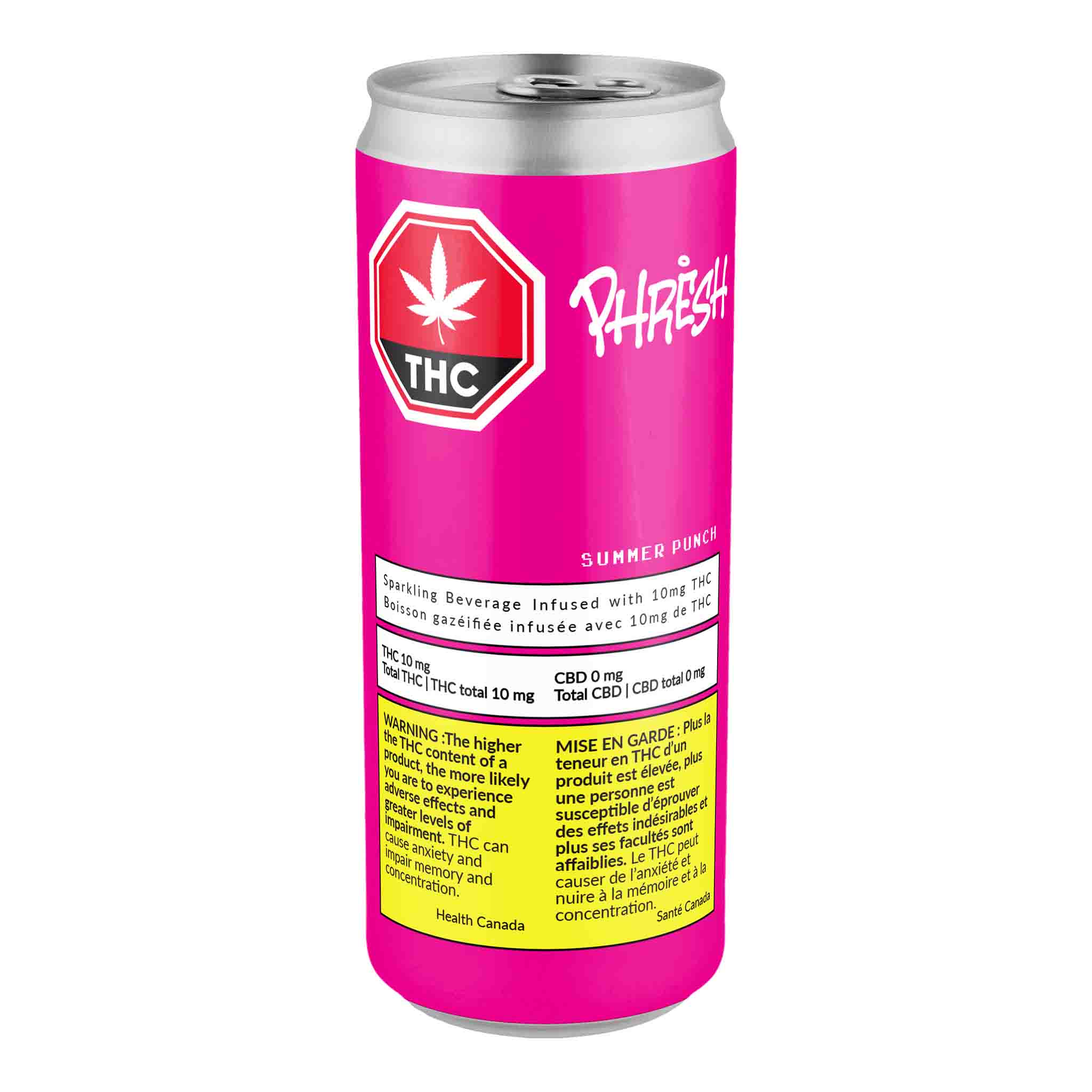 PHRESH Summer Punch is all summer chilling vibes. This sparkling water contains 10 mg THC with no added sugar. Carbonated water, natural flavours, cannabis emulsion (water, gum acacia, modified coconut oil (medium chain triglycerides), citric acid, vitamin E, potassium sorbate, sodium benzoate, quillaia extract), citric acid **Important Winter Shipping Advisory** Due to sub-freezing temperatures during transit, canned beverages may occasionally arrive with slightly swollen cans. This is a completely normal and harmless occurrence caused by the liquid inside temporarily freezing and expanding — it does not affect the safety, quality, or taste of the product once thawed. **If your cans arrive frozen or swollen:** Simply allow them to thaw completely at room temperature before opening and enjoying. The cans will return to their normal shape, and your beverages will be perfectly fine to drink. **Order Limit:** Each order can include a maximum of 24 canned beverages. To order more than 24, please place multiple orders. We appreciate your understanding during these colder months — thank you for choosing us! ❄️